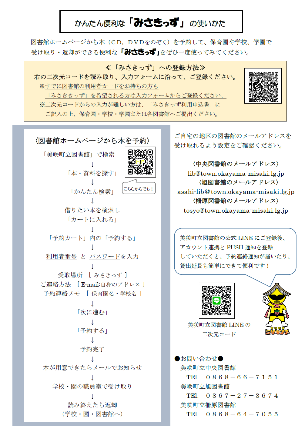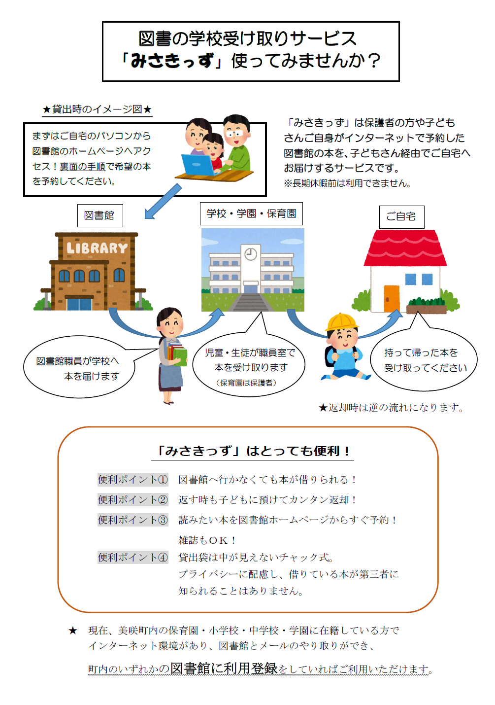 保護者の方や子どもさんご自身がインターネットで予約した美咲町立図書館(中央・旭・柵原)の本を、子どもさん経由でご自宅へお届けするサービスです。